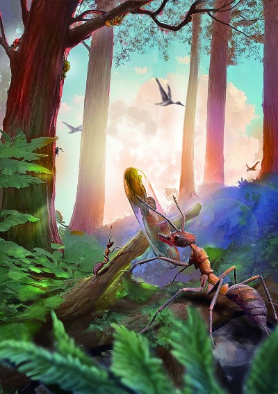白垩纪古蚁衔着感染的蚁蛹(茧内)场景复原图。杨定华绘