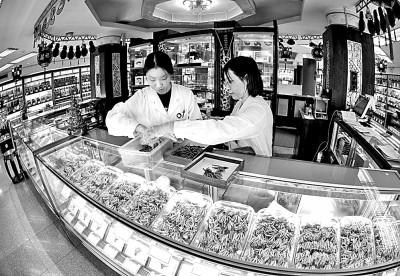 工作人员在北京市西城区某中医馆整理中药材。新华社发