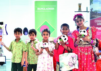 来自孟加拉国的小朋友展示他们购买的大熊猫玩偶。新华社发