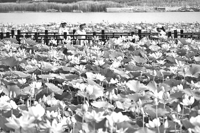 夏日时节,河南省开封市西北湖湿地公园风光秀丽、荷花盛开,吸引许多市民和游客前来观赏。图为6月14日,人们在西北湖湿地公园观赏荷花。李俊生摄/光明图片