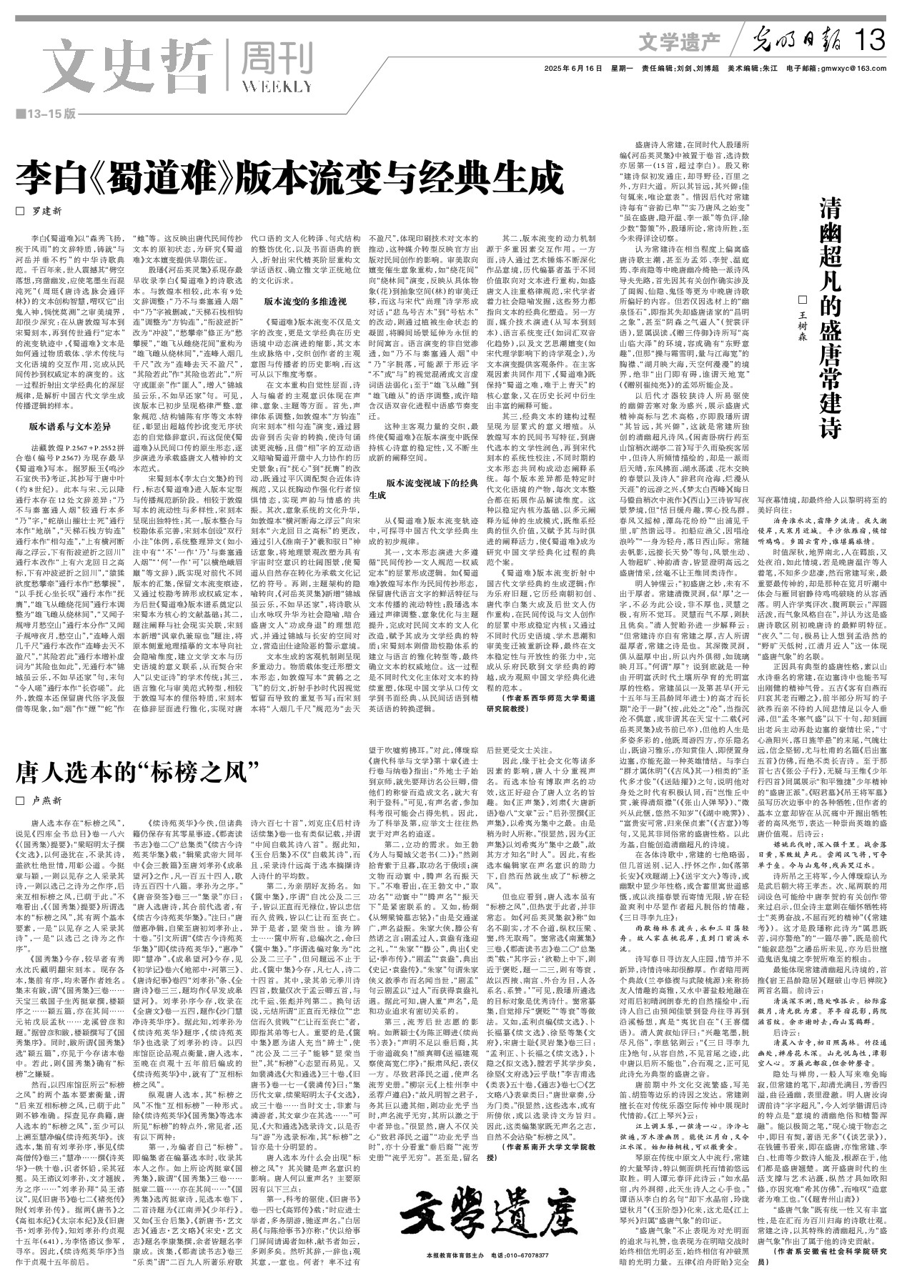 其一,文本形态演进大多遵循“民间传抄—文人规范—权威定本”的层累形成逻辑。如《蜀道难》敦煌写本作为民间传抄形态,保留唐代语言文字的鲜活特征与文本传播的流动特性;殷璠选本通过声律调整、意象优化与主题提升,完成对民间文本的文人化改造,赋予其成为文学经典的特质;宋蜀刻本则借助校勘体系的建立与语言的雅化转型等,最终确立文本的权威地位。这一过程是不同时代文化主体对文本的持续重塑,体现中国文学从口传文学到书面经典、从民间话语到精英话语的转换逻辑。
