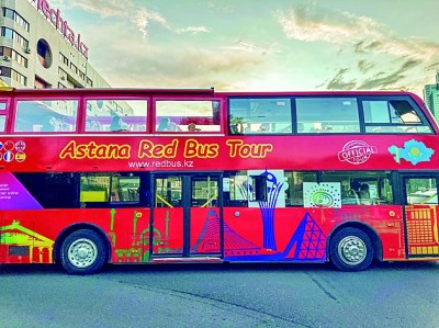 穿行在阿斯塔纳街头的旅游观光巴士。