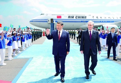 习近平抵达阿斯塔纳纳扎尔巴耶夫国际机场时,托卡耶夫总统率总统办公厅主任达杰拜、副总理兼外长努尔特列乌、总统外事顾问卡济汉、阿斯塔纳市长卡瑟姆别克等高级官员热情迎接。身着盛装的哈萨克斯坦女青年向习近平献花。礼兵分列蓝地毯两侧致敬,哈萨克斯坦少年儿童手持中哈两国国旗热烈欢迎习近平到访。习近平在托卡耶夫陪同下观看仪仗队分列式,直升机悬挂中哈国旗从机场上空飞过。在机场贵宾楼内,两国元首还共同欣赏哈萨克斯坦少年儿童的文艺表演。