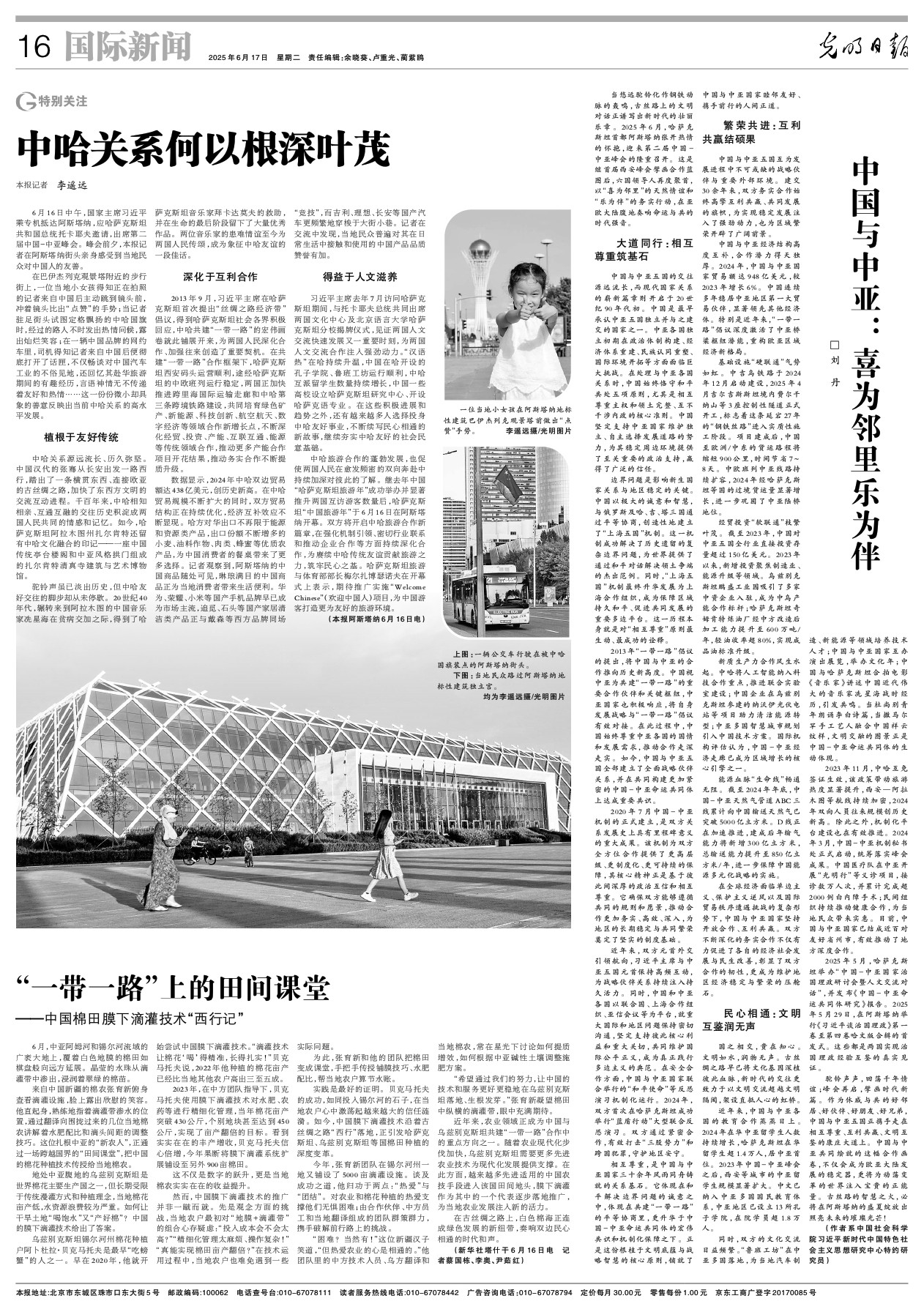 6月,中亚阿姆河和锡尔河流域的广袤大地上,覆着白色地膜的棉田如棋盘般向远方延展。晶莹的水珠从滴灌带中渗出,浸润着翠绿的棉苗。