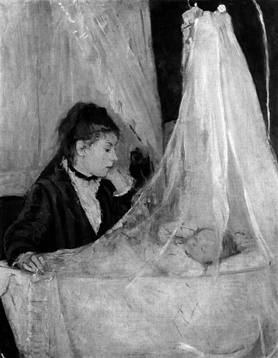 1874年4月15日,印象派首展以“落选者沙龙”之名在巴黎开幕,被后世视为现代艺术的发端。莫里索携《摇篮》参展,在这幅描绘姐姐及其刚出世女儿的画作中,母亲透过轻薄纱帐注视着婴儿,画面被一种母爱的光晕笼罩,令观者感受到那疲惫又怜爱的眼神,仿佛也被带入画中温馨静谧的氛围里。对这次在当时看来“离经叛道”的印象派首秀,学院派在绘画技法方面进行质疑,在创作风格上冷嘲热讽。如莫奈的《日出・印象》被讽刺“不过是未完成的墙纸草稿”,雷诺阿的《舞者》《剧院包厢》被责备轻浮,德加的《舞蹈课》被指责市井,而整场画展被揶揄是“六个疯子和一个女人的画展”。这一评论看似对莫里索在《摇篮》中温和的绘画语言有所认可,实则暗含给她贴上女性身份标签而未列入艺术家之意。