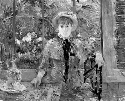瑰丽色彩,是莫里索风景写生的基调。婚后不便常常外出写生,莫里索就致力于描绘花园、公园、田园中的人物。她在户外先用水彩或色粉画出草图,回到家中再以油画精细描摹。如1889年创作的《摘橘子》,对比草图色稿和油画成品可见各有其韵致,草图中的光色呈现之精美甚至不逊于成品。又如1891年创作相似题材的《樱桃树》时,莫里索先画出了三幅色稿,反复推敲不同光线下色温、色相的微妙变化。精巧的设色、自由的笔触、梦幻的氛围,皆以莫里索从自然中采撷灵感、剪辑光影的理念为基础,她也将这些理念和技法无私地与印象派画家们分享。在其影响下,马奈画作中的用色越来越明亮,雷诺阿作品中也能看到受莫里索启发的痕迹——以光色对比表现空气流动,印象派画家们画阴影时普遍不再使用高纯度的黑灰色,而代之以作为橙红日光色补色的冷调蓝色,使暗部更“透气”。善用白色调并营造呼吸感,是莫里索的又一大长项,从《怀特岛上的欧仁·马奈》到《午餐后》,在窗台或阳台等半敞开的空间中,只要有天光倾泻进来,她总是能将画中人物完美融于周遭环境,就像绘画也是她的“精神窗口”一样。
