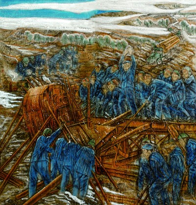 写意人物画的设色与造型取之于生活,还需转化为画家笔下的意象符号。形象的塑造与色彩的攫取更多的是体现人物精神面貌与画面的整体构成,这也符合传统笔墨的内在需求。如中国国家画院画家赵奇创作的《长江源》(图②),以墨线勾勒出人物、布满天空的云气,以及雪山与河流。画中人物选取了当地居民与外来游客的典型形象,山脉河流则是长江源头的写照。与惯用手法不同的是,创作者以色彩皴擦人物结构,利用人物之间以及背景的留白突出流水的意象。从整体观之,作品设色单纯简洁,但就局部构成而言,其设色则因笔意的充实显得十分丰富,即在设色用笔中强化点线交织的皴法形式,追求干、湿、浓、淡的丰富变化。色墨并用充分发挥了中国画特有的材料属性和工具特色,在注重笔意的基础上使色与墨的交融更富韵味。盛天晔的作品《秋水》(图④)将女性人物与众多动物形象置于山水之间,画家有意识地将丰富笔触统一在淡淡墨色中,衬托钴蓝、赭石的特性,建构出秋风瑟瑟水悠悠的意境。笔者在长期的创作实践中,结合早期浙派人物画的笔墨训练与北派人物画的造型观念,进行了一系列意象人物画创作。如作品《铁人精神·那年 那月 那日》(图⑤)描绘了热火朝天的建设场景,在创作中,我以墨线勾勒人物与场景物象,并以层层叠加的色彩皴擦营造出特殊的时代意境。