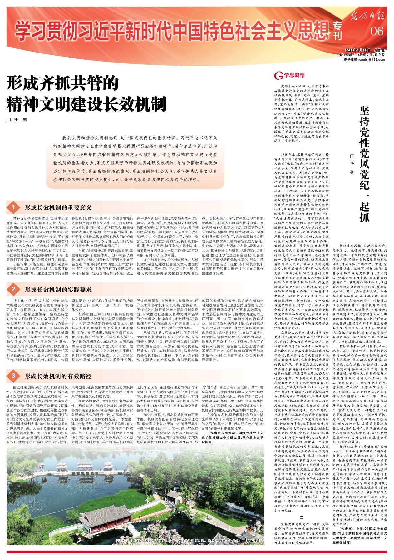 坚持常态长效,做到抓常、抓细、抓长。其一,重在经常。把党性党风党纪一起抓作为一项重要的常态化任务来推进,将其融入经济建设、政治建设、文化建设、社会建设、生态文明建设等各领域具体工作,实现增强党性、砥砺作风、严明党纪与工作提质增效之间的良性互动。其二,重在细节。“小事小节中有党性、有原则、有人格”,小事小节也见作风、见纪律。大量案例显示,党员干部的腐化堕落往往始于小事小节处失守,因而必须从节庆送礼、会所接待等细节入手,出实招、见实效。其三,重在久久为功。构建全方位的党员发展培养体系,一体开展党性、党风、党纪教育,定期分析思想动态,调整培养对象;改进党员管理监督机制,将党性修养、党风廉政建设纳入考核体系;探索组织、宣传、纪检监察等部门协同机制,开展联合督导,形成治理合力。