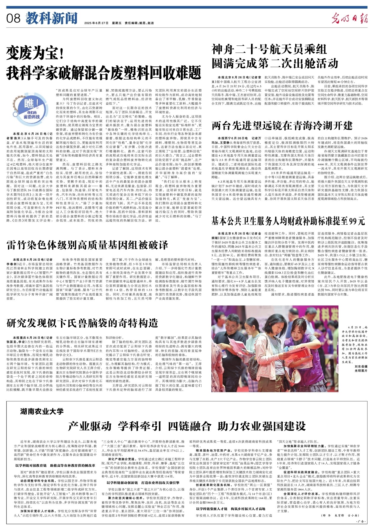 本报北京6月26日电(记者晋浩天)从触手可及的快餐盒、矿泉水瓶到遍布生活的家电外壳、医用器材,从田间铺设的农用地膜到屋顶高架的太阳能光伏板,如今,塑料制品无处不在。然而,全球每年生产超过4亿吨塑料,绝大部分在废弃后因难以高效回收而长期滞留于自然环境,造成严重的“白色污染”和巨大的资源浪费,成为困扰全球环境治理的突出难题。面对这一问题,北京大学马丁教授团队26日凌晨在国际学术期刊《自然》上发表一项开创性研究,成功将复杂难处理的混合废塑料变废为宝,无须烦琐分拣,可直接转化为多种高附加值化学品,为根治全球塑料污染顽疾提供了新的思路。《自然》同期发文评论称:“该成果是应对全球年产巨量塑料问题的重要进展。”