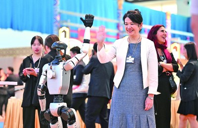 6月25日,嘉宾在第十六届夏季达沃斯论坛文化之夜上和人形机器人互动。新华社发