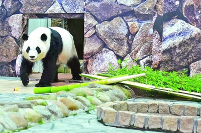 图②:日本和歌山县白浜冒险世界游乐园内的四只旅日大熊猫——良浜、彩浜、结浜和枫浜,即将于6月28日启程返回中国。临行前一日,众多游客纷纷前来与它们道别,送上祝福与感谢。图为6月27日,旅日大熊猫彩浜在白浜冒险世界游乐园内玩耍。新华社发