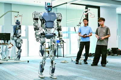 近年来,湖北省加快布局人形机器人领域,依托省内高校院所的人才优势和创新体系优势,组织武汉大学、华中科技大学等参与人形机器人相关项目研发,集中推出“天问”“劳动者”“荆楚”等一系列人形机器人。图为6月30日,华中科技大学博士研究生钱乐天(右)对“劳动者”系列人形机器人进行平地全向行走测试。新华社记者 杜子璇摄