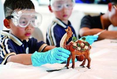日前,河南洛阳的小朋友们参与了模拟考古发掘、“文物”修复、传统体育游戏等体验活动,在寓教于乐中感受古都洛阳厚重的历史文化魅力。图为小朋友在体验“文物”修复。张光辉摄/光明图片