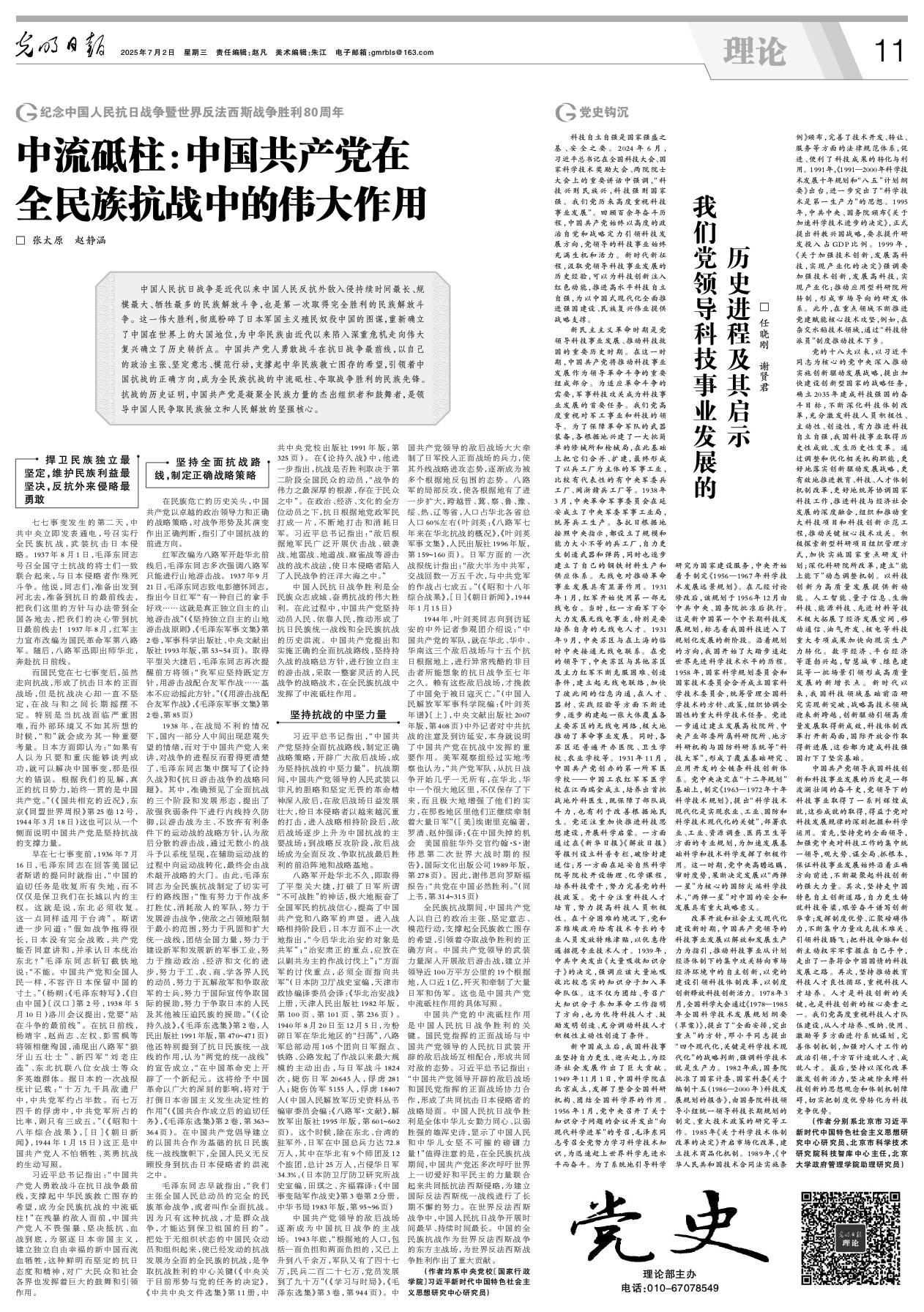 全民族抗战期间,中国共产党人以自己的政治主张、坚定意志、模范行动,支撑起全民族救亡图存的希望,引领着夺取战争胜利的正确方向。中国共产党领导的武装力量深入开展敌后游击战,建立并领导近100万平方公里的19个根据地,人口近1亿,歼灭和牵制了大量日军和伪军。这也是中国共产党中流砥柱作用的具体写照。