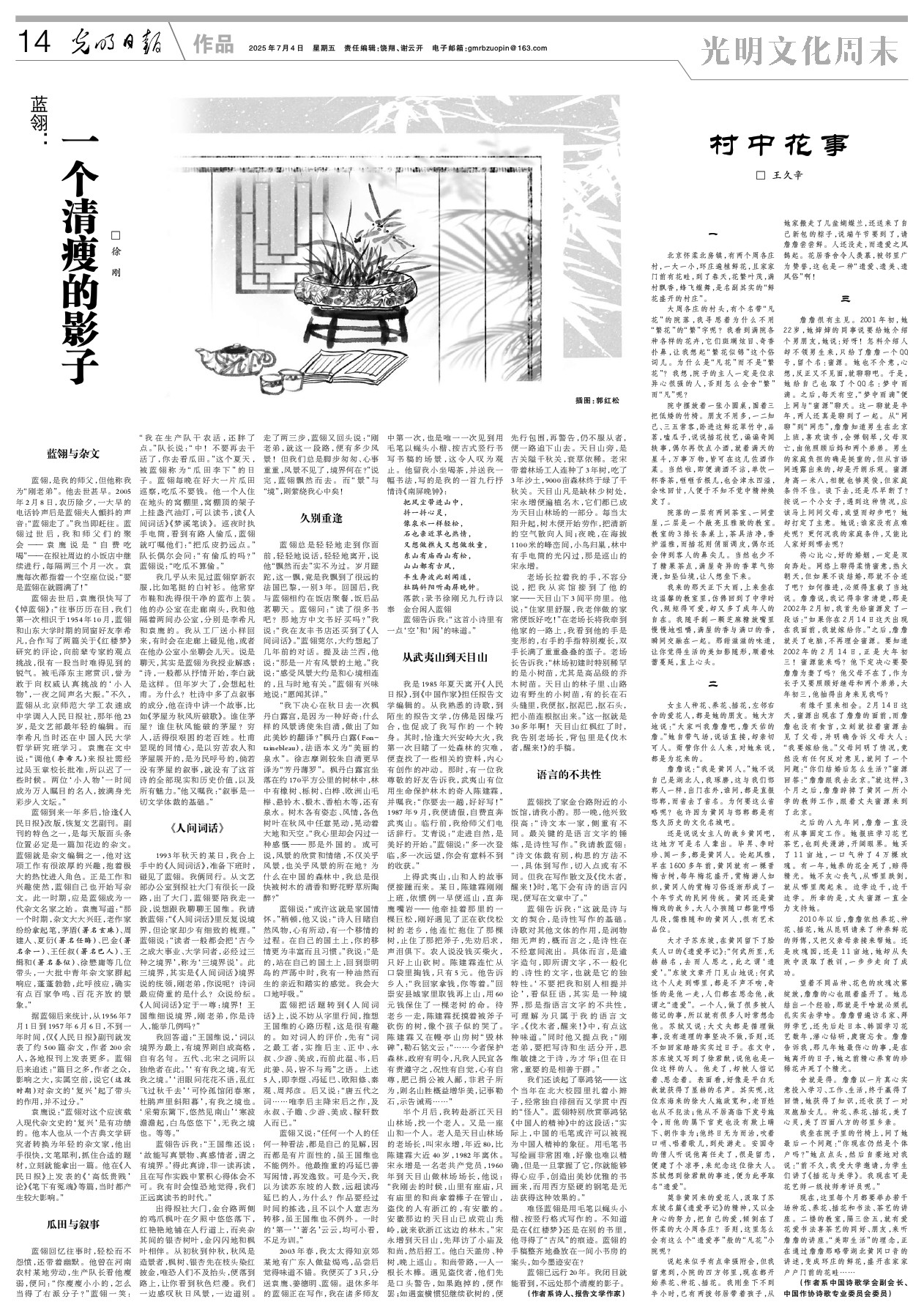 我几乎从未见过蓝翎穿新衣服,比如笔挺的白衬衫。他常穿布鞋和洗得很干净的蓝布上装。他的办公室在走廊南头,我和他隔着两间办公室,分别是李希凡和袁鹰的。我从工厂送小样回来,有时会在走廊上碰见他,或者在他办公室小坐聊会儿天。说是聊天,其实是蓝翎为我授业解惑:“诗,一般都从抒情开始,李白就是这样。但年岁大了,会想起杜甫。为什么?杜诗中多了点叙事的成分,他在诗中讲一个故事,比如《茅屋为秋风所破歌》。谁住茅屋?谁住秋风能破的茅屋?穷人,活得很艰困的老百姓。杜甫显现的同情心,是以穷苦农人和茅屋展开的,是为民呼号的,倘若没有茅屋的叙事,就没有了这首诗的全部现实和历史价值,以及所有魅力。”他又嘱我:“叙事是一切文学体裁的基础。”