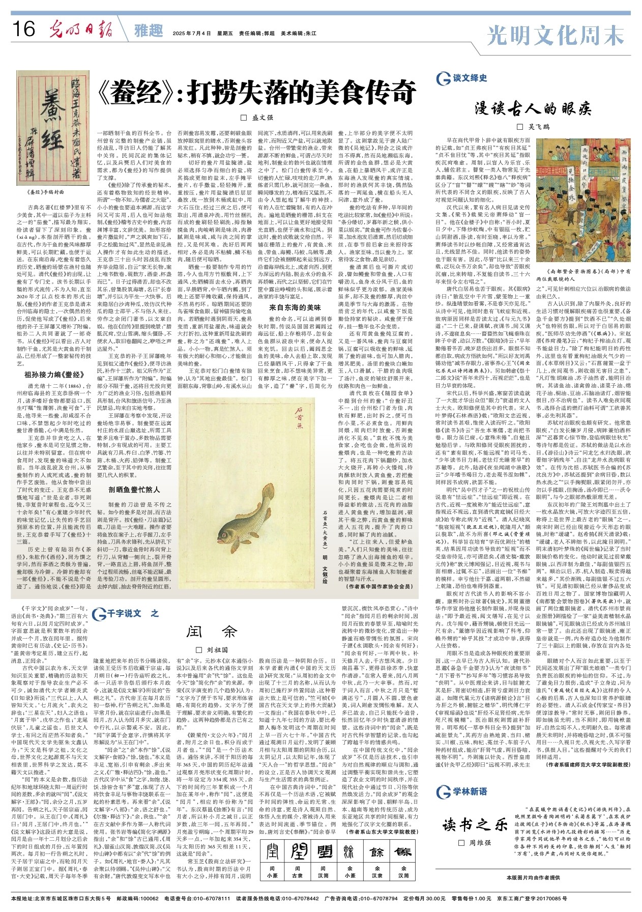《鲞经》除了传承鲞的秘术,还有着格物致知的经世精神。所谓“一物不知,为儒者之大耻”,小小的鲞也要追本溯源,而这学问又可实用,后人也可如法炮制。《鲞经》稽考古史中的鲞,内容渊博丰富,文辞优美。如形容给鲞片撒盐时,“声之飒爽如下石,手之松脆如过风”,显然是亲见渔人操作才有如此生动的描述。王克恭三十出头时因战乱而放弃举业隐居,自云“家无长物,案上唯书数卷,砚数方,酒壶、杯盏而已”。日子过得清苦,却也不改其乐,曾集股筑海塘,名曰“长春塘”,并引以为平生一大快事。后来隐居白沙湾种瓜,效仿汉代种瓜的隐士邵平,不与俗人来往。劳作之余闭门著书,以文章自娱。他在《自传》里提到晚景:“腊胝沉疴,空山雪满,缩头僵卧,不便求人,取旧卷翻阅之,咿唔之声达屋外。”