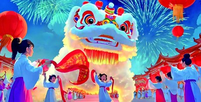 国风绘画创作不仅以静态形式呈现,还可在AI赋能下被用于动画视频的合成和虚拟3D场景的创建,实现动态演绎,让观众沉浸于数字化的东方幻境。2025年新春到来之际,人民日报英文客户端发布了名为《巳巳如意》的AI共创治愈系贺岁微视频(图②),用一段AI动画讲述了传统年俗中百姓燃放烟花、驱赶年兽以及和生肖相伴的节庆故事。艺术家将创建的国风故事画面生成短视频后再剪辑完成,充分体现出智能图像工具在生成瑰丽奇幻场景时的效率优势,使古老传说通过时尚梦幻的数字形式鲜活地呈现出来。