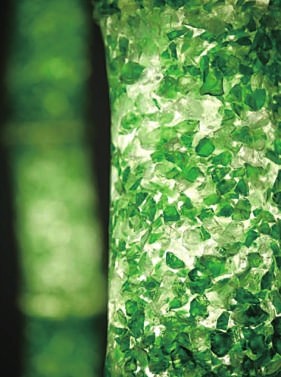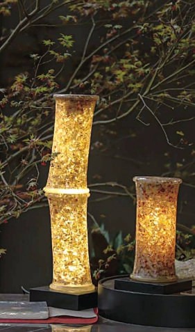 该作品在材料的选取上同样极具创意。创作之初,设计师将多种城市生活中的常见废弃物进行对比,希望将那些不可降解的材料用于灯具的制作,以传达环保的理念。经过多轮测试,创作者最终选取了废旧玻璃瓶作为原料,并将大量棕色、绿色及无色透明的玻璃瓶碾碎为长宽约1cm的颗粒。这样的尺寸既不会因太过细碎导致其整体视觉效果过于浑浊,也不会因颗粒太大显得层次单一,能够较好地呈现出晶体颗粒的通透感。在色彩的营造上,设计师希望该灯具能反映出竹子在不同季节的固有颜色。因此,他将无色透明玻璃颗粒分别与棕色、绿色玻璃颗粒进行混合,再浇灌透明树脂塑形,以营造“春”与“秋”的不同意象。无色透明玻璃颗粒的融入大大增加了材料的透光度,当这些玻璃颗粒作为灯具的内容物包裹住LED光源时,便可呈现出璀璨的光感。