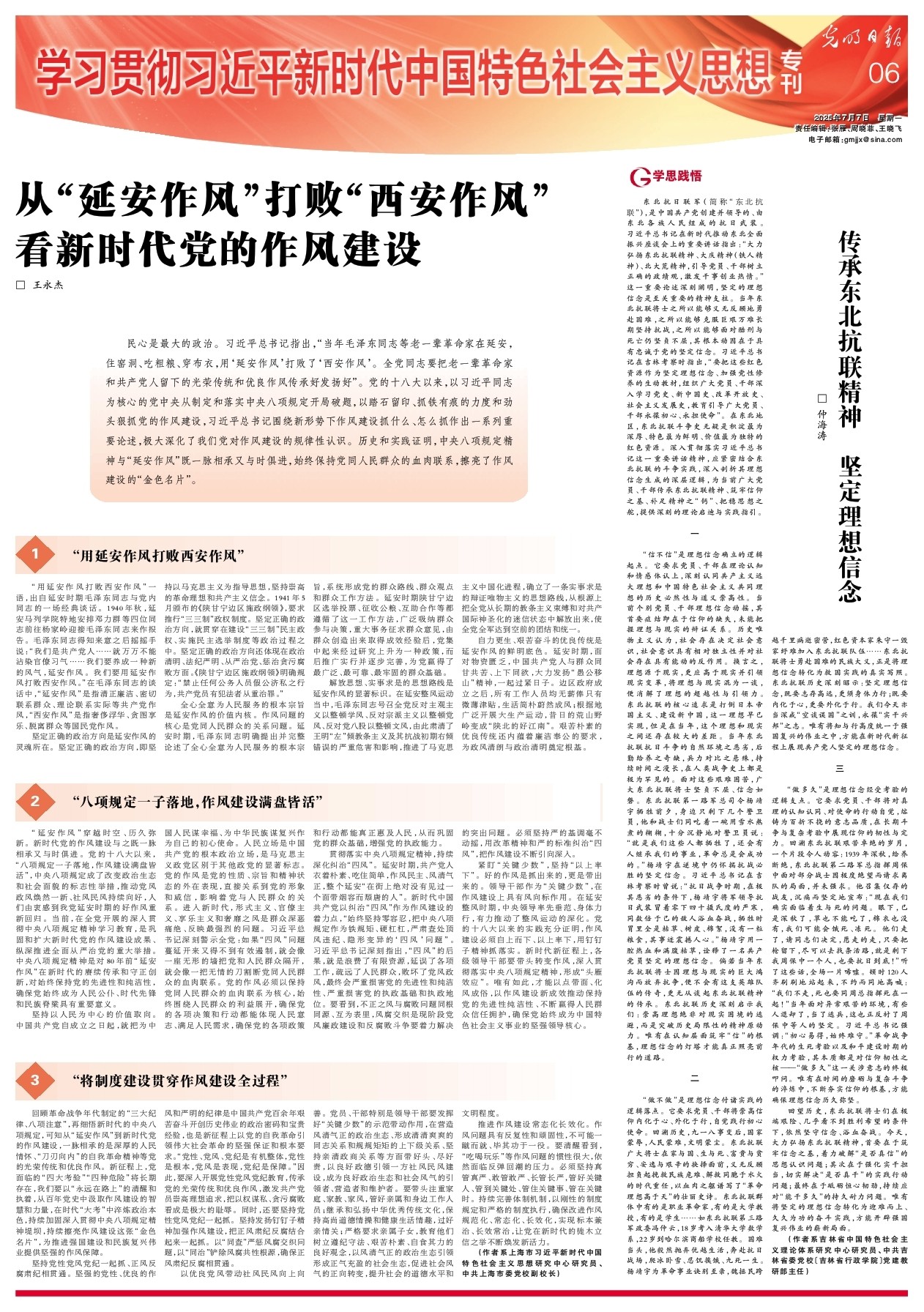 回顾革命战争年代制定的“三大纪律、八项注意”,再细悟新时代的中央八项规定,可知从“延安作风”到新时代党的作风建设,一脉相承的是深厚的人民情怀、“刀刃向内”的自我革命精神等党的光荣传统和优良作风。新征程上,党面临的“四大考验”“四种危险”将长期存在,我们要以“永远在路上”的清醒和执着,从百年党史中汲取作风建设的智慧和力量,在时代“大考”中淬炼政治本色,持续加固深入贯彻中央八项规定精神堤坝,持续擦亮作风建设这张“金色名片”,为推进强国建设和民族复兴伟业提供坚强的作风保障。