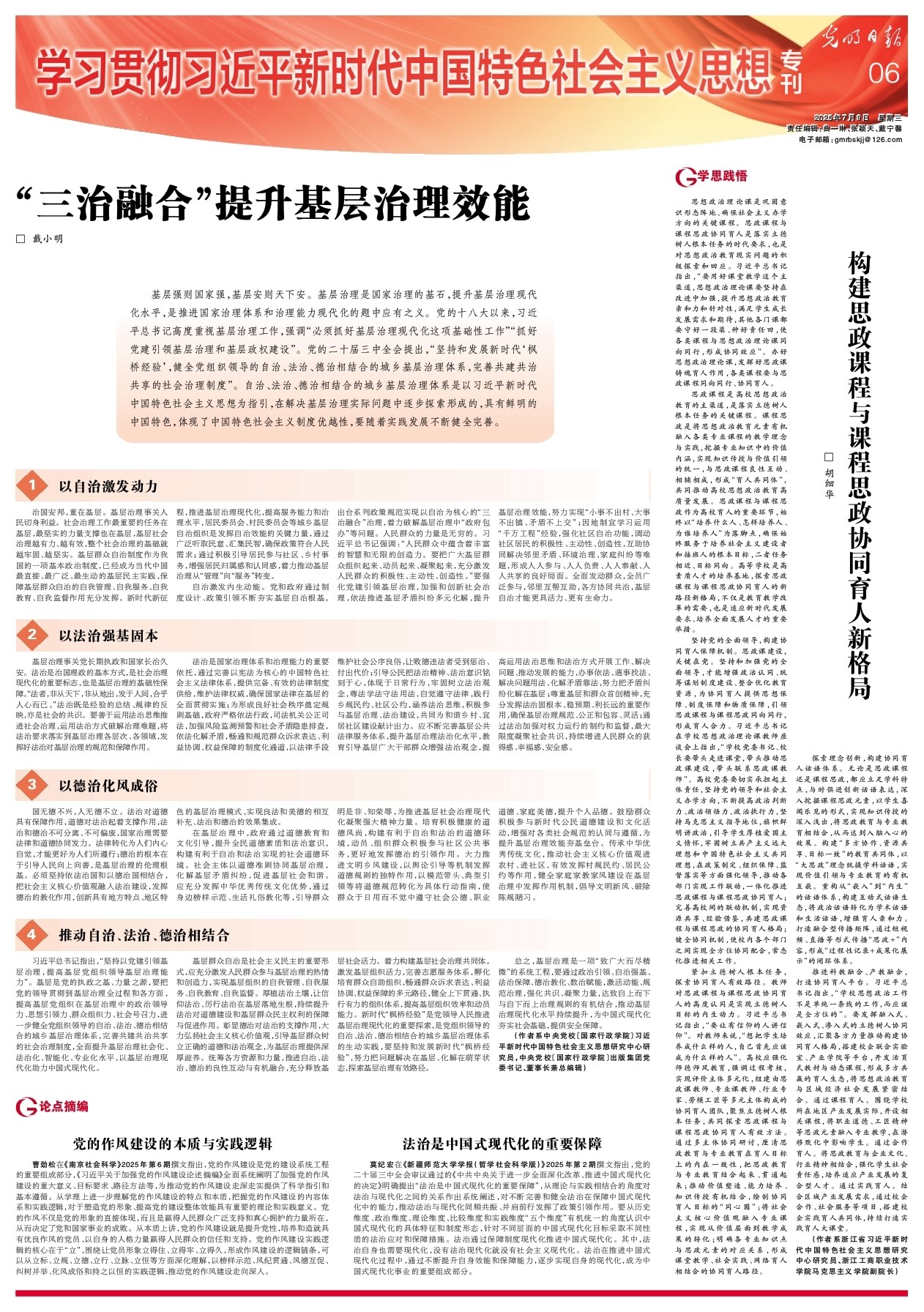 基层强则国家强,基层安则天下安。基层治理是国家治理的基石,提升基层治理现代化水平,是推进国家治理体系和治理能力现代化的题中应有之义。党的十八大以来,习近平总书记高度重视基层治理工作,强调“必须抓好基层治理现代化这项基础性工作”“抓好党建引领基层治理和基层政权建设”。党的二十届三中全会提出,“坚持和发展新时代‘枫桥经验’,健全党组织领导的自治、法治、德治相结合的城乡基层治理体系,完善共建共治共享的社会治理制度”。自治、法治、德治相结合的城乡基层治理体系是以习近平新时代中国特色社会主义思想为指引,在解决基层治理实际问题中逐步探索形成的,具有鲜明的中国特色,体现了中国特色社会主义制度优越性,要随着实践发展不断健全完善。