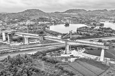 7月8日,成渝中线高铁土桥枢纽互通双线特大桥连续梁顺利合龙,该连续梁全长约242米,是成渝中线高铁重庆段跨度最大的连续梁。成渝中线高铁是我国“八纵八横”高铁网沿江通道的重要组成部分,正线全长292公里,设计时速350公里。图为成渝中线高铁土桥枢纽互通双线特大桥建设现场。新华社记者 唐奕摄
