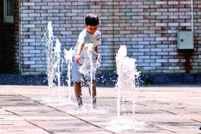 7月8日,儿童在布加勒斯特市街头的喷泉中纳凉。新华社发