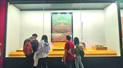 乾隆帝行书《土尔扈特全部归顺记》卷前,不少观众驻足细读。纸卷上的“若今之土尔扈特,携全部,舍异域,投诚向化,跋涉万里而来,是归顺,非归降也”,与之呼应的《万法归一图》屏,以浓丽色彩再现了乾隆帝于热河(今河北承德)接见渥巴锡的场景。