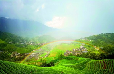 我朝远处的彩虹望去,那七彩斑斓的光晕装扮着古老侗寨,一头连着记忆深处的乡村,一头连着如今的美好生活。