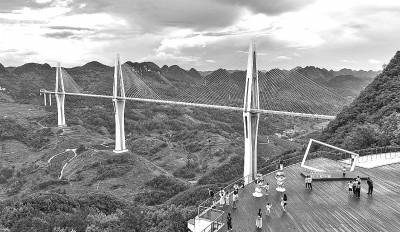 近年来,贵州省黔南布依族苗族自治州平塘县依托平塘特大桥推进“桥旅”融合发展,着力打造“天空之桥”观光服务区内临崖观景酒店、观星露营地、桥梁博物馆、主题餐厅等综合旅游设施,丰富旅游新业态,为文旅产业发展注入新活力。图为7月10日,游客在平塘县“天空之桥”服务区观光。 新华社记者 杨文斌摄