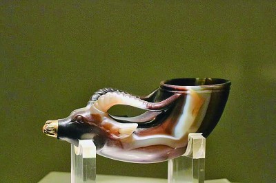 细观其质,它由红、棕、白三色相杂的缠丝玛瑙制成,层次分明、纹理如画。“有专家推测,这件酒器所用的玛瑙应当产自西域。”陕西师范大学历史文化学院教授杨瑾介绍,更珍贵的是,此杯乃迄今所见唐代唯一一件俏色玉雕,展现了工匠“依色取巧,随形变化”的精湛工艺:工匠在雕刻兽角和耳朵的地方,巧借玛瑙浅色纹理,化天然纹理为神工。