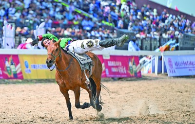 7月11日,内蒙古自治区第二届蒙古马超级联赛开幕式在锡林郭勒盟太仆寺旗举行。比赛设置了耐力赛、团体接力赛、跑马射箭、跑马拾哈达、传统走马五个竞赛项目。图为演员在开幕式上表演。新华社记者 贝赫摄