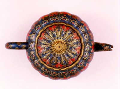 乾隆时期,盛行以粉彩工艺装饰紫砂壶,点染和套色的手法凸显了宫廷茗壶的雍容格调。故宫博物院藏有“宜兴窑紫砂胎绿地粉彩描金瓜棱执壶”(图②)一对,其制作工序是先在宜兴烧制内胎,进呈宫廷后再由造办处加工,茗壶通体以金线勾勒莲花、蝙蝠、牡丹、杂宝纹、如意云纹,并点缀红、黄、青地粉彩。蝙蝠与云纹的组合寓意“洪福齐天”,莲花与杂宝纹的搭配则象征“福寿安康,生生不息”。