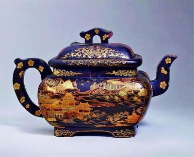 待粉彩传入民间后,其装饰内容更为丰富,并在外销壶中发展出蓝彩装饰,即以含有氧化钴的釉料配方与二次烧成技术,创造出蓝中闪翠的独特视觉效果,为茗壶带来清雅的气质。直至晚清,泥绘工艺的出现为紫砂壶彩绘装饰增添了新的语言。匠人执笔以泥浆为墨,以壶为卷,勾勒山水亭榭,寥寥数笔尽显文人画意。泥浆入胎后经窑火淬炼与壶体浑然相融,形成独特的“泥中水墨”效果,既延续了紫砂器“素器为骨,装饰点睛”的传统,又将文人画的写意精神注入器皿,使其成为可握于掌心的艺术图卷。