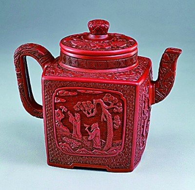 雕漆工艺又称剔红,在紫砂器上的应用并不多见,而以名匠时大彬所制紫砂器为漆器胎骨者,可见故宫博物院藏晚明“宜兴窑紫砂胎剔红山水人物图执壶”(图④)。此壶为方体、圆口,通体髹红漆,四面开光,内刻“松荫品茗”与“高士对谈”场景,壶底髹黑漆,漆下隐现“时大彬造”四字楷书款。明朝末年,宫廷特有的雕漆工艺已无人能继,直至乾隆时期才得以在宫廷中再现,此件紫砂胎雕漆壶无疑为这类风格的雕漆作品提供了断代的参照依据。