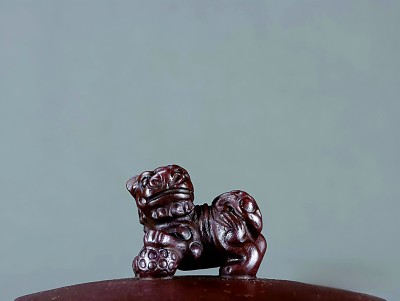 壶钮是紫砂壶盖顶端的重要部件,其体积虽小,却在造型设计中具有画龙点睛的作用。清代中期是紫砂壶对外贸易发展极为繁盛的时期,出现了各类以刻塑技法装饰的壶钮,如花卉钮、瓜果钮、金蟾钮、龙钮、鱼钮、鹿钮、狮钮等。其中狮钮(图⑥)最为常见,造型可谓千姿百态,有仰首踩球的、低首戏球的、扭头抱球的、匍匐观球的等等。这类壶钮通常以圆雕、镂刻手法制作,匠人们穷其工艺塑造出百兽之王的威武与灵动,只为借茗壶寄托“狮子滚绣球,好运在后头”的吉祥祝愿。