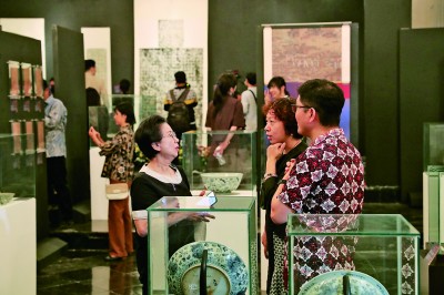 “万里尚为邻——纪念郑和下西洋620周年中国印尼文化交流展”7月11日晚在印度尼西亚雅加达美术和陶瓷博物馆开幕。图为展览现场。新华社发