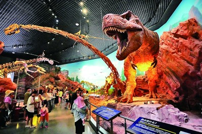 进入暑期,位于云南省澄江市的澄江化石地世界自然遗产博物馆迎来参观及研学热潮,参观者在5.18亿年前的寒武纪化石群中探寻生命起源奥秘,感受地球生命演化的壮丽历程。图为7月15日,游客在澄江化石地世界自然遗产博物馆参观恐龙模型及化石。新华社记者 陈欣波摄