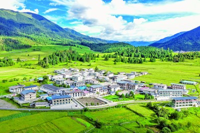7月15日,位于西藏自治区林芝市巴宜区的鲁朗小镇,藏式风格民居与高山田园牧场相映成趣,景色迷人。申学强摄/光明图片