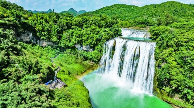 近日,位于贵州省安顺市的黄果树瀑布正处于夏日最佳观赏期。7月16日,在阳光的照射下,黄果树瀑布前架起一道彩虹,美丽的景象吸引各地游客前来观赏游玩。新华社记者 陶亮摄