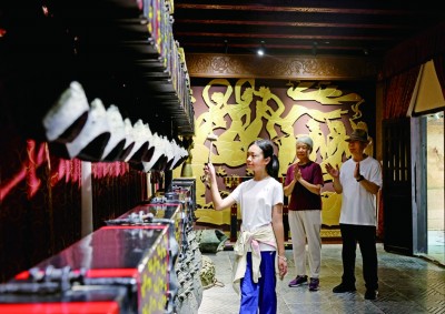 来自河南省郑州市的游客在湖北省宜昌市兴山县昭君村体验编钟乐器。