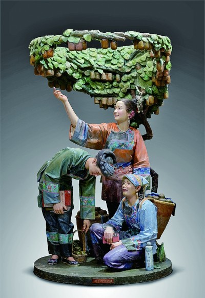笔者于2024年创作了以湘西十八洞村精准扶贫为主题的雕塑《果子熟了——十八洞村记事》。作品中的三个主体人物均是返乡创业的大学生,他们呈一立、一俯、一蹲的姿态,正在采摘新鲜的猕猴桃,脸上洋溢着幸福的笑容。在实地采风过程中,我目睹了新农人们手持智能手机在田间地头直播果实采摘,将家乡的特产远销全国各地,也看到年轻的创业者们在闲暇时手捧书籍,学习乡村振兴经验。于是,我将这些生动的细节融入雕塑创作,试图传达出一种积极向上的精神力量,让更多人感受到乡村产业发展的蓬勃活力。