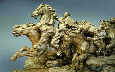 当然,细节的塑造不仅依赖于艺术技巧,更考验着创作者对于个体经验及情感的准确表达。邓柯的主题性雕塑作品《蒙古族赛马节》展现了赛马节上热火朝天的场面。创作者是南方人,在北方深入生活的过程中爱上了骑马。她一次次体验着于马背上驰骋的畅快,并敏锐地发现,那份酣畅淋漓之感与中国传统绘画笔断意连的美学表现十分相似。因此,她在创作中对人物的动态、表情、服饰以及马匹等细节都进行了写意化处理,彰显出骏马奔腾的速度感,极富感染力。