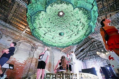 7月16日,在意大利威尼斯,参观者在第19届威尼斯国际建筑双年展中国馆观看展品《苍穹》。第19届威尼斯国际建筑双年展中国馆展览正在意大利威尼斯的军械库及双年展花园展出。本届中国馆展览以“容·智慧”为主题。展览集结12位(组)建筑师,以良渚文明、敦煌石窟、北京中轴线、城市交通与未来城市为主题,呈现10件(套)作品,展现中国建筑在传统与未来之间的对话与思考。新华社发