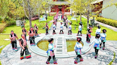 彝族打歌,又称“踏歌”,是融歌、舞、乐于一体的民族艺术瑰宝,是彝族人民抒发情感、表达心声的重要方式,承载着丰富的精神文化内涵。图为7月18日,云南省大理白族自治州巍山彝族回族自治县彝族打歌队在巍山县文华书院排练。新华社记者 彭奕凯摄