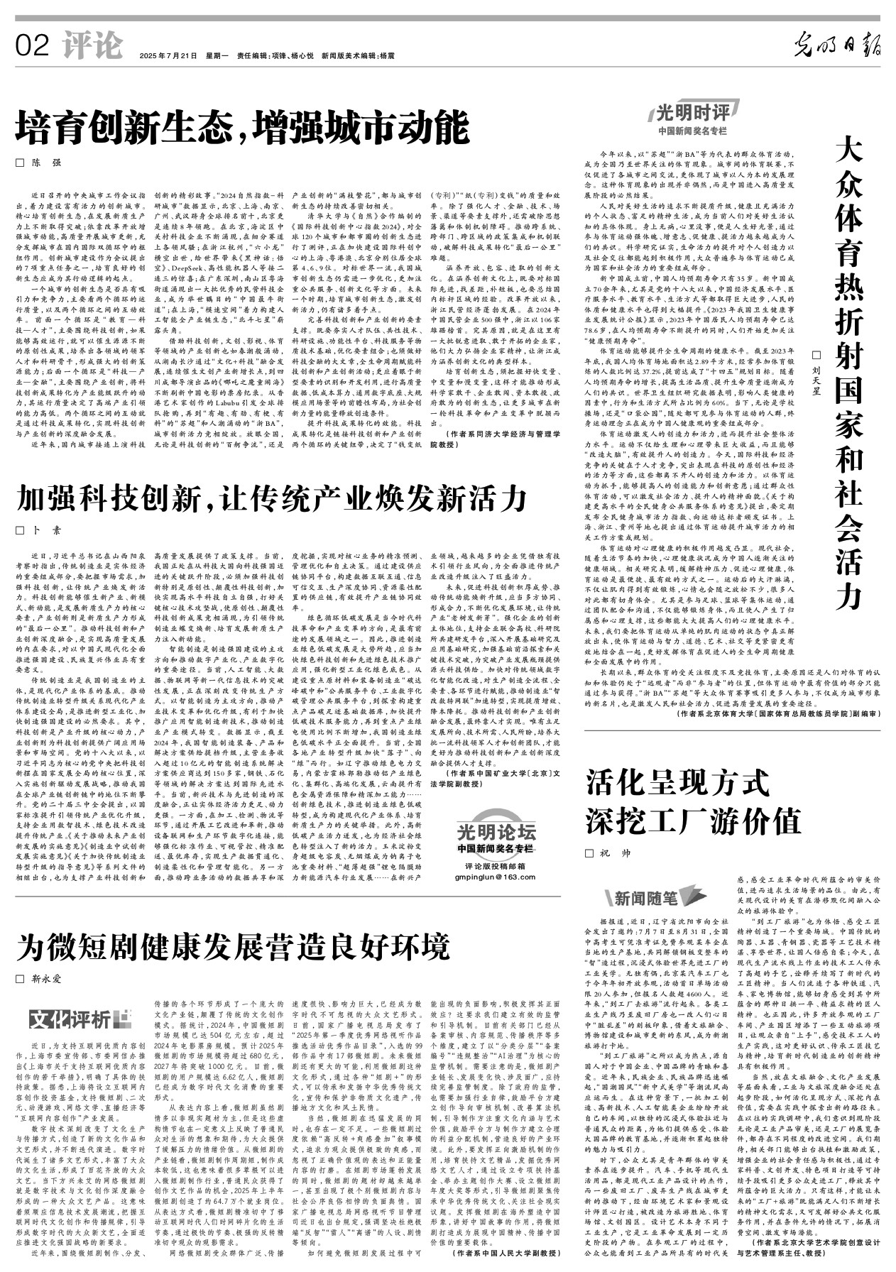 借助科技创新,文创、影视、体育等领域的产业创新也如春潮般涌动,从湖南长沙通过“文化+科技”融合发展,连续催生文创产业新增长点,到四川成都导演出品的《哪吒之魔童闹海》不断刷新中国电影的票房纪录。从香港艺术家创作的Labubu引发全球排队抢购,再到“有趣、有劲、有梗、有料”的“苏超”和人潮涌动的“浙BA”,城市创新活力竞相绽放。放眼全国,无论是科技创新的“百舸争流”,还是产业创新的“满枝繁花”,都与城市创新生态的持续改善密切相关。