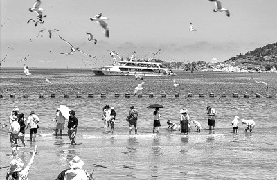 夏日炎炎,山东省荣成市海驴岛迎来了旅游高峰,游客们纷至沓来,享受悠闲夏日时光。图为7月19日,游客在海驴岛海域一处沙滩踏浪游玩。李信君摄/光明图片