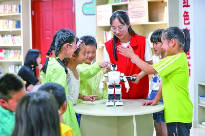 暑假期间,多地开设公益暑托班,让孩子们度过一个快乐充实的假期。图为7月21日,在江苏省南通市通州区金沙街道天熹社区开办的公益暑托班机器人课程中,南通大学的大学生志愿者与孩子们互动。新华社发