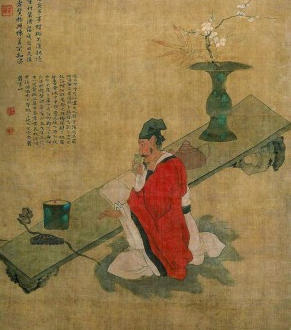 值得一提的是,明代文人对于古朴清雅的审美追求,不仅反映在花材与花器的选择上,还体现在赏花时的意境中。《瓶史》在论述插花品赏时有云:“茗赏者上也,谈赏者次也,酒赏者下也。”明代文人插花推崇品茗清赏,追求高雅清净,借由插花来体悟生命的真趣。陈洪绶的《校书图》中,两位文士分坐于石案两侧执卷阅读,案上的宽口白瓷花钵内插白梅一支,与书籍、茶具、古铜器相映成趣。画面简约高古,毫无市井野气,只留雅致清韵。