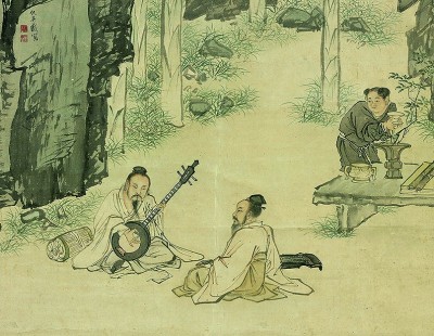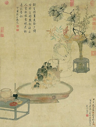 隐逸山水,是中国历代文士的一种风雅理想。陈洪绶的《雅集图》描绘了万历年间一群文士雅集的场景。林木苍翠、湖石秀奇的山水园林中,长条石案上摆一尊塑像,前置香炉、瓶荷供奉,图卷左侧人物正是《瓶史》作者袁宏道,他两手支杖,神态庄重而淡泊。