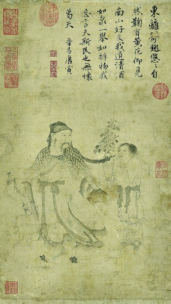 如在前文提到的陈洪绶所作《痛饮读骚图》中,书案上的瓶花格外引人瞩目,画中人物虽身在屋内,却与梅竹相伴,仿佛置身林泉之境,俨然一位脱俗隐者,尽显文人雅士气韵风骨。而在传为唐寅所绘《采菊图》(图②)中,陶渊明持杖而行,一童仆手捧瓶菊随侍,瓶中菊花用淡墨点染,自在随性,反映了陶渊明的隐逸追求和高洁品格。